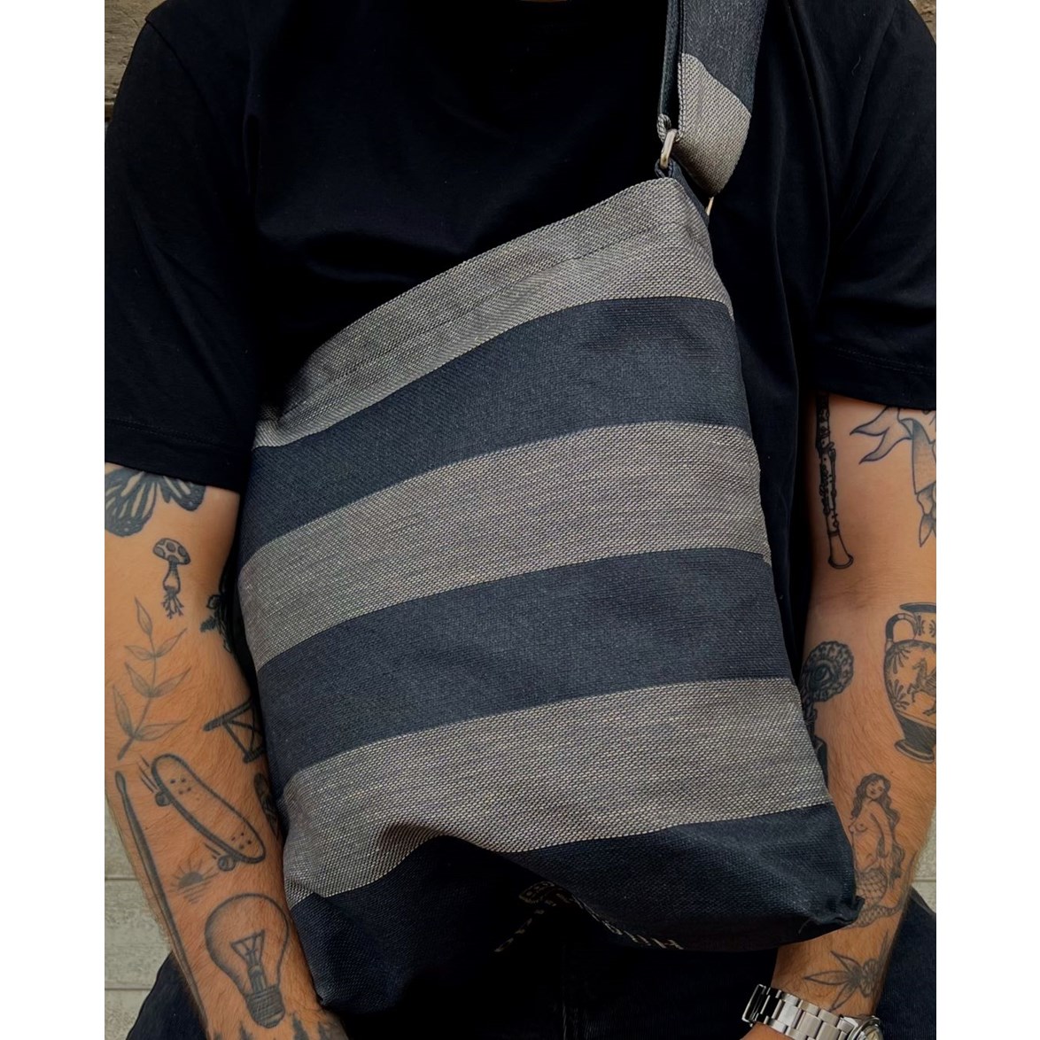 Messenger Bag Gestreift Schwarz Hellgrau