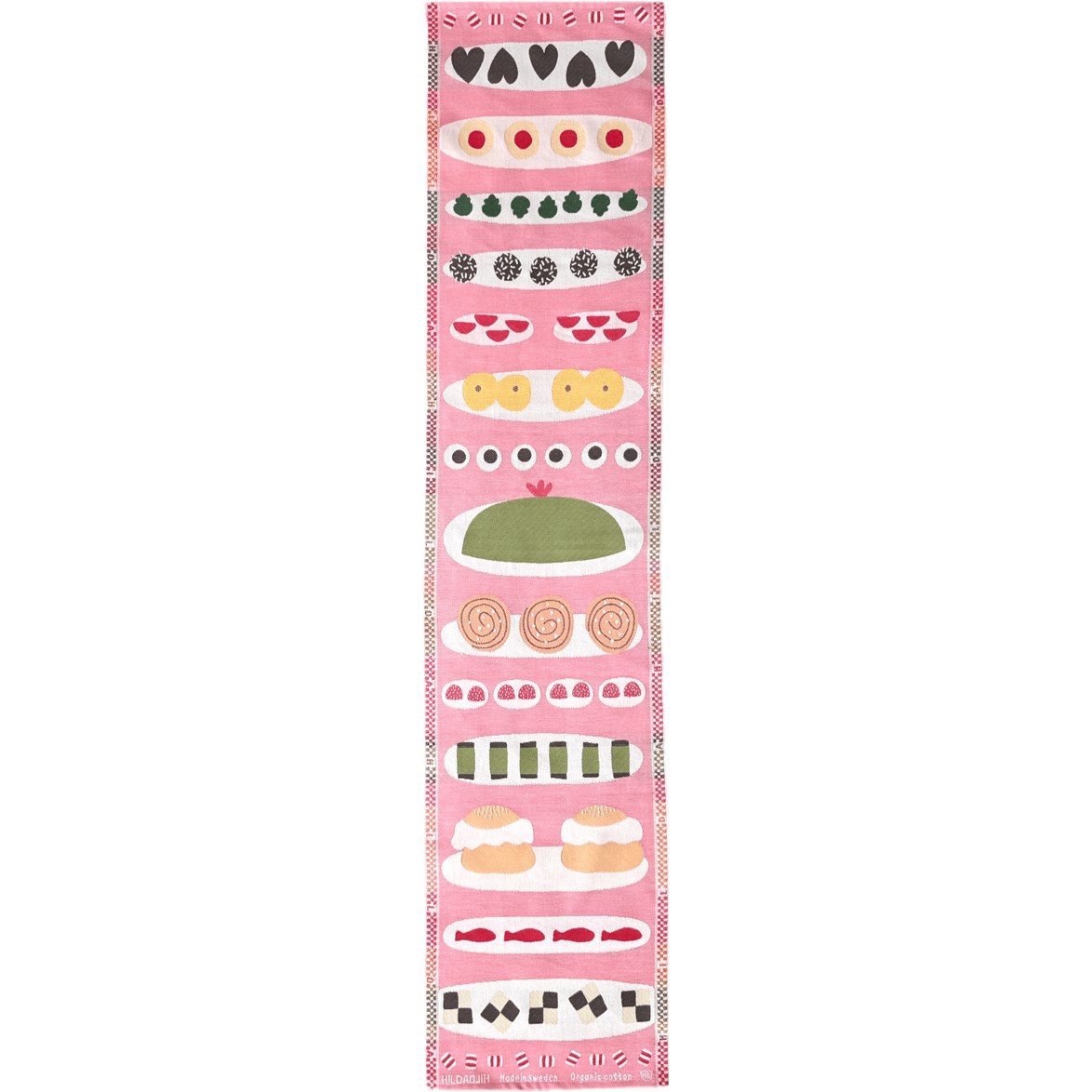 Löpare med godsaker som vävs i ekologisk bomull. Löparen fungerar perfekt som bordslöpare men kan även hängas upp.