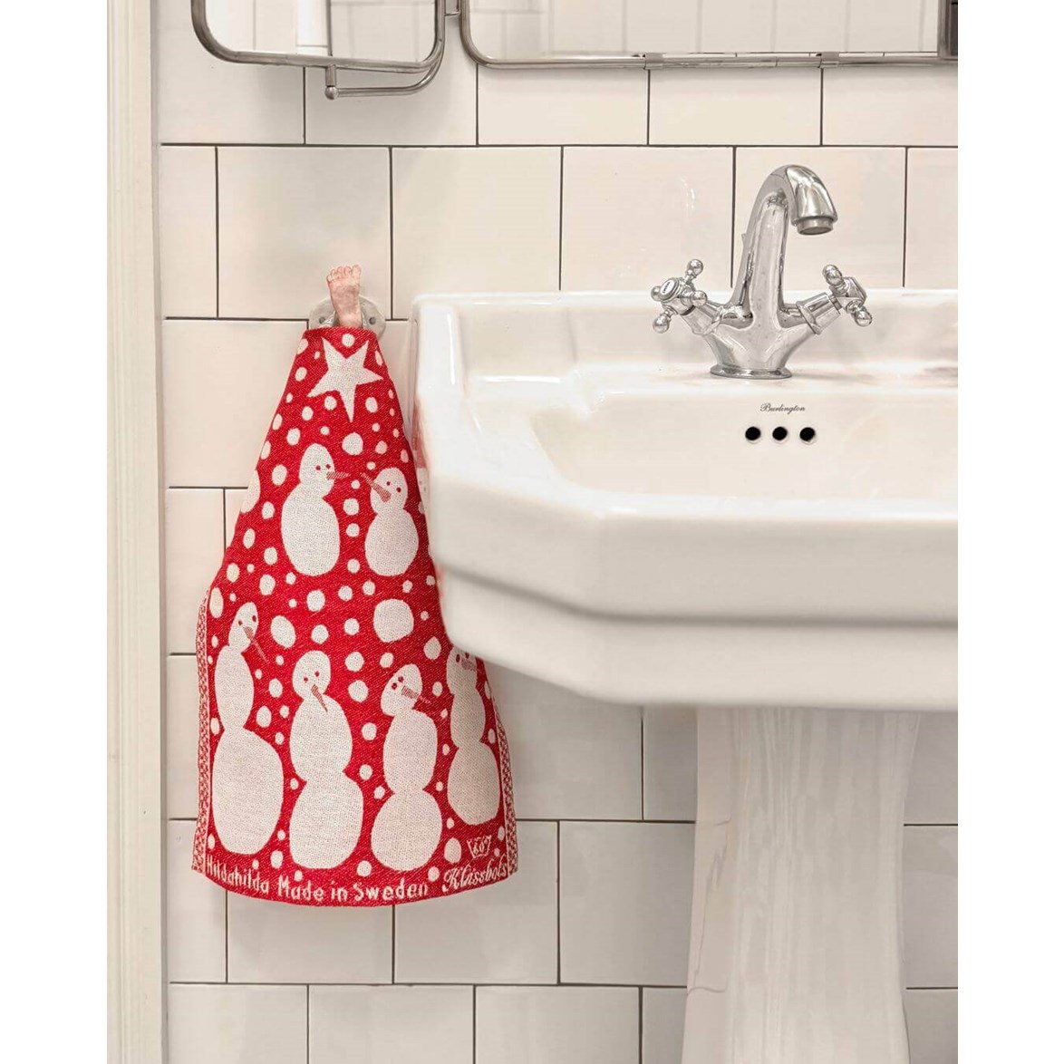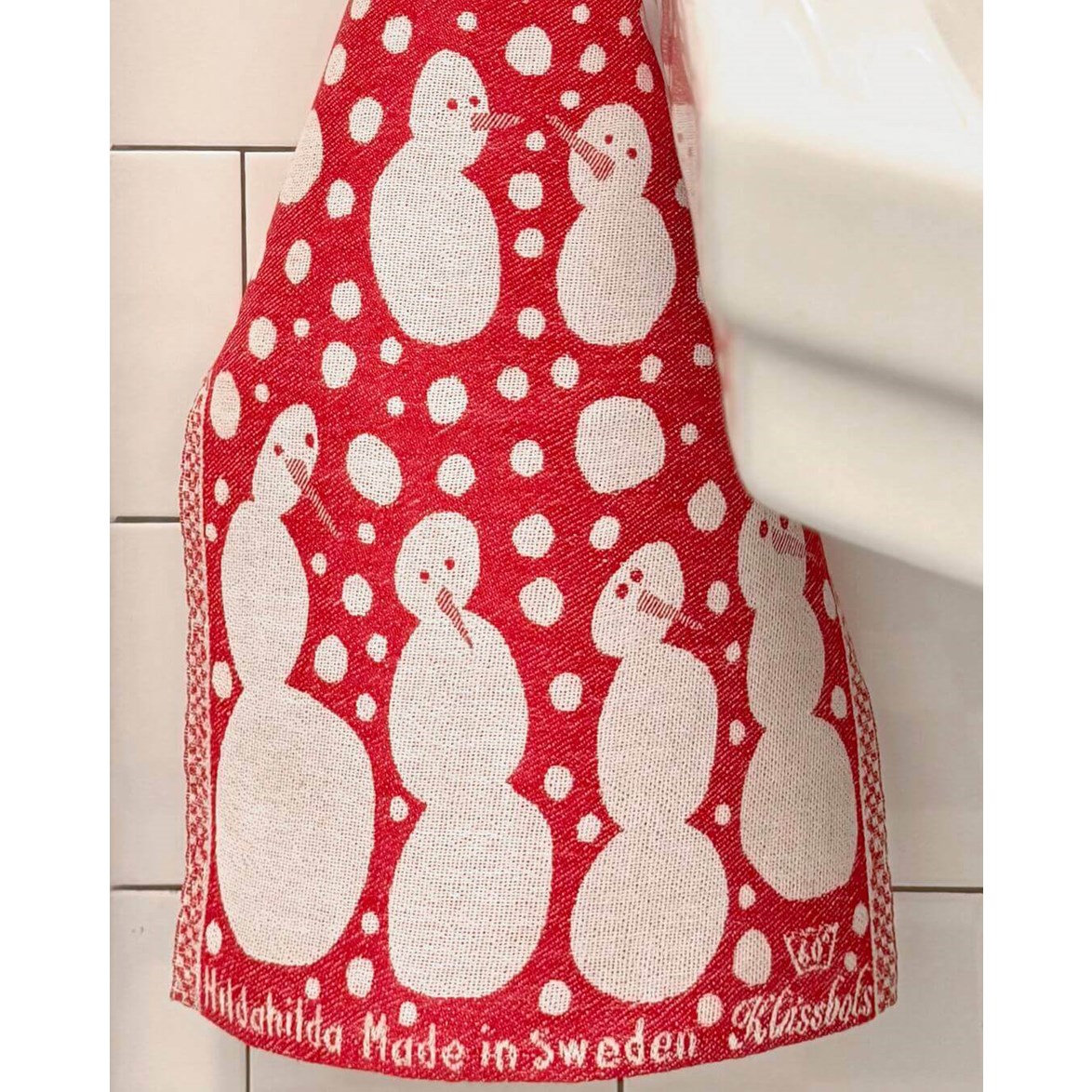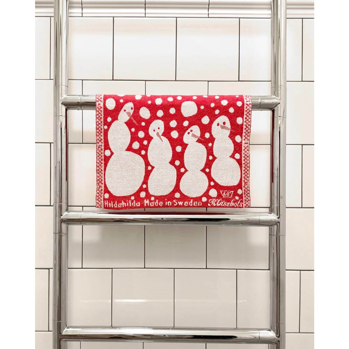En liten linnehandduk med snögubbar som vävs på Klässbols i Värmland. Den är slitstark och har en otrolig vattenuppsugningsförmåga och blir bara vackrare med tiden. Handduken fungerar perfekt som gästhandduk eller som en liten handduk i köket.