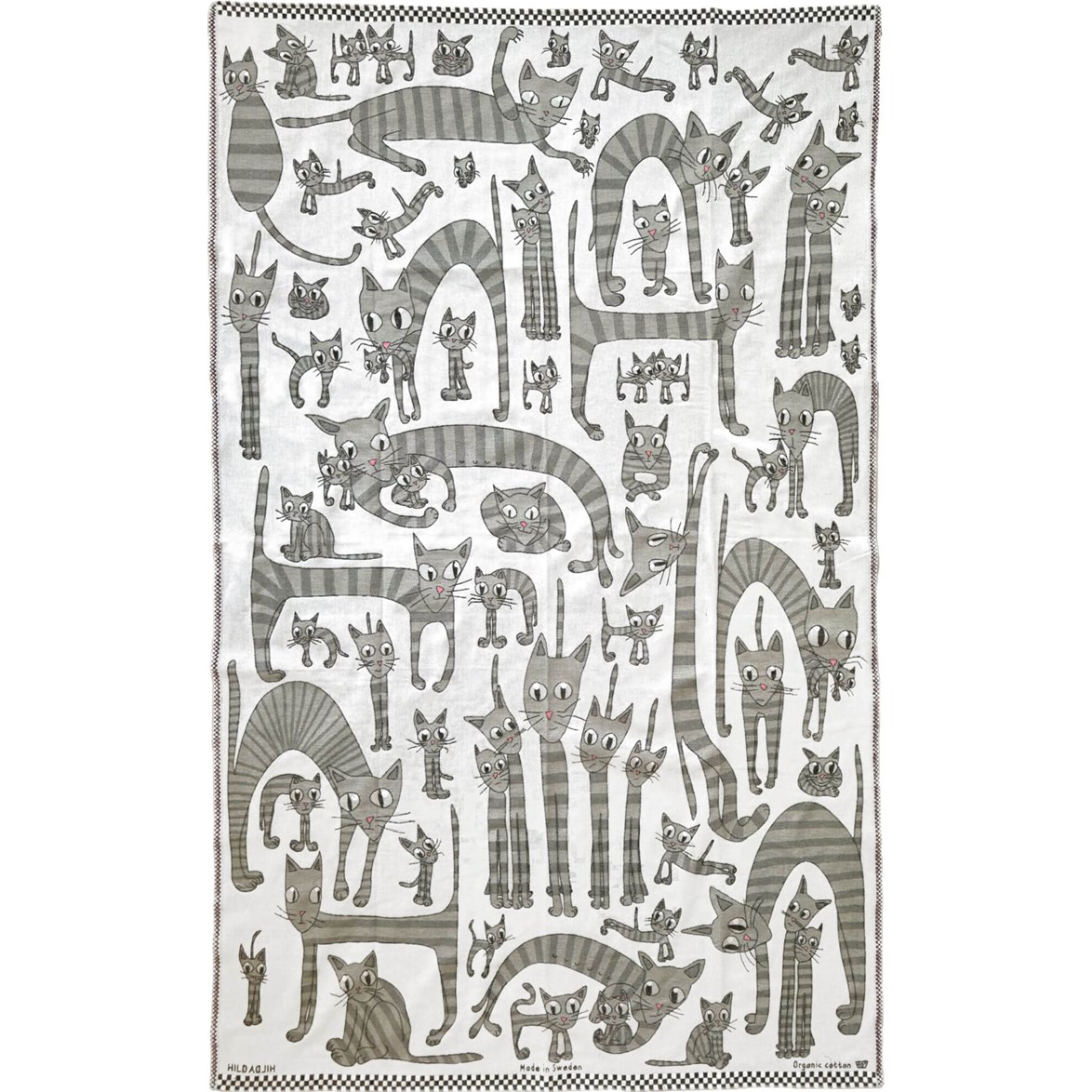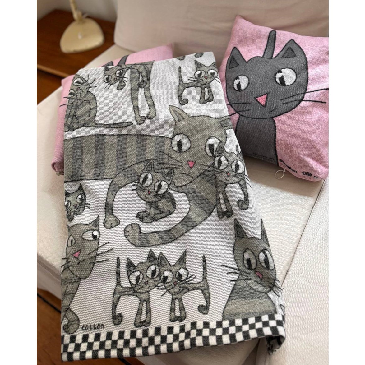 Pläd i ekologisk bomull med katter, perfekt för att värma dig i soffan, fåtöljen eller sängen.